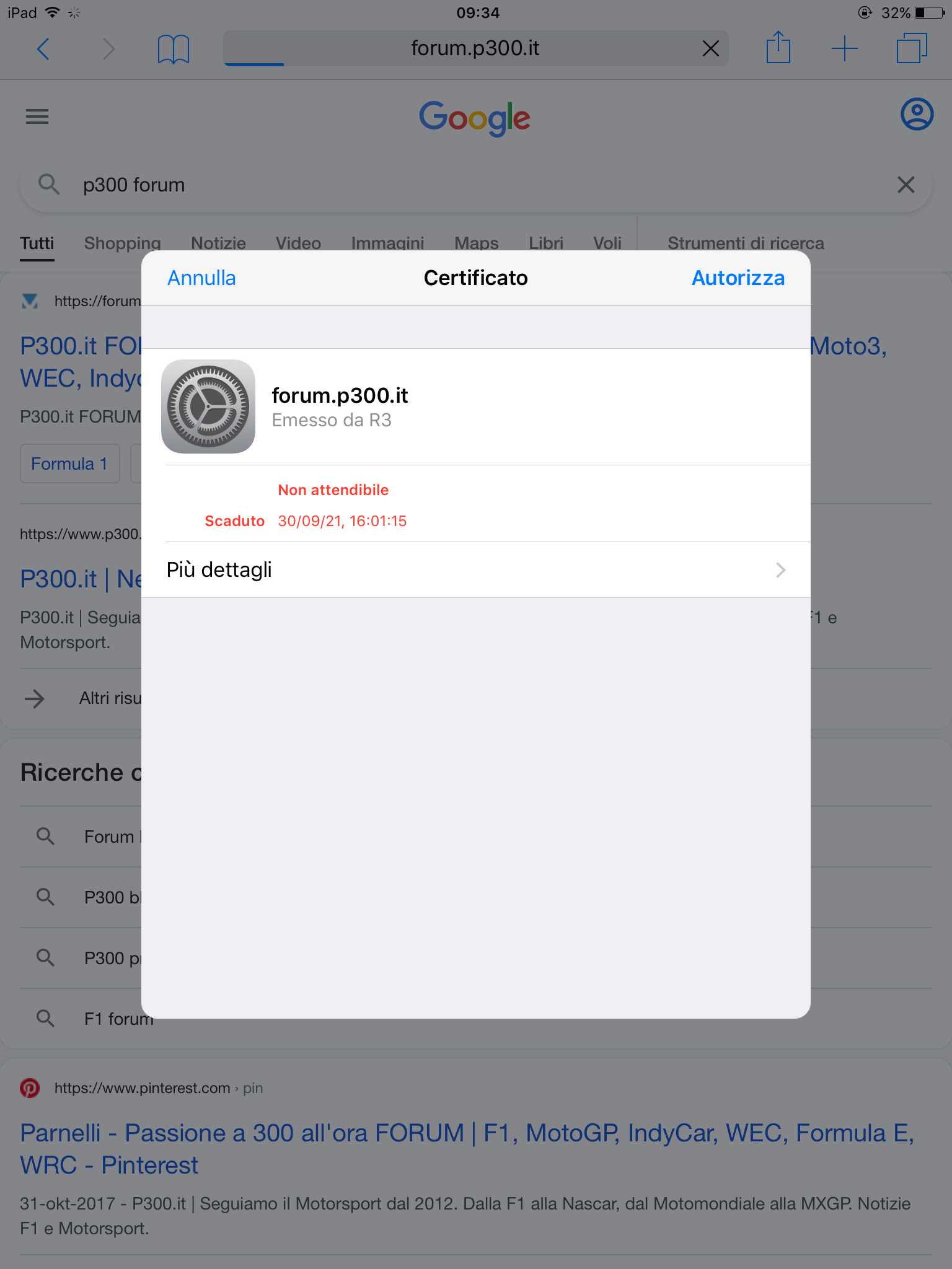 C'è qualcuno, oltre a me, impossibilitato ad accedere al sito e al forum con i dispositivi mobili? Nel mio caso accade con un tablet, un Apple Ipad 3 iOS 9.3.6 (13G37). Da ieri pomeriggio compare la pagina bianca con il messaggio "La connessione non è privata etc ... NET::ERR_CERT_DATE_INVALID". Ho utilizzato Chrome versione 63.0.3239.73 (non posso più aggiornarla visto che mi è precluso accedere all'iOS 10) e il browser Safari. Con Safari compare il messaggio "L'identità di forum.p300.it non può essere verificata da Safari. Per continuare, rivedi i dettagli del certificato". A questo punto premo su "Dettagli" e mi informa che questo certificato sarebbe scaduto il giorno 30/09/'21 alle ore 16:01:15. In realtà, c'è da dire che lo stesso problema l'ho riscontrato, facendo una prova a campione, con alcuni pochi altri siti.